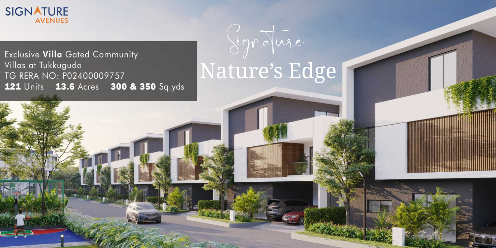 Explore Signature Nature’s Edge Villas in Tukkuguda – an exclusive community of thoughtfully planned and 100% Vastu-compliant, 121 elegant 4BHK villas in generous 300 & 350 sq. yds layouts. Nestled on 13.6 acres of serene landscape. Thoughtfully designed to provide comfort, privacy and modern living. Offering seamless connectivity to the ORR (Exit 14) and Srisailam Highway, you can enjoy quick access to the city while retreating to a tranquil, nature-inspired location.